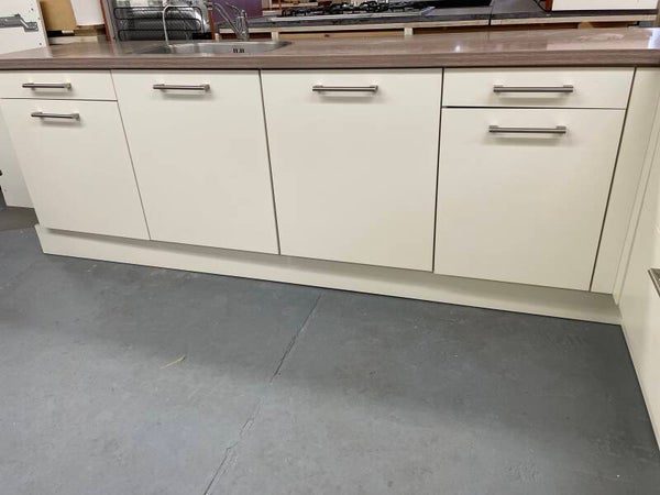 Een nette Licht Vanille kleur keuken met hout fineer werkblad (kleine beschadiging in blad) voorzien van softclose deuren en lades.